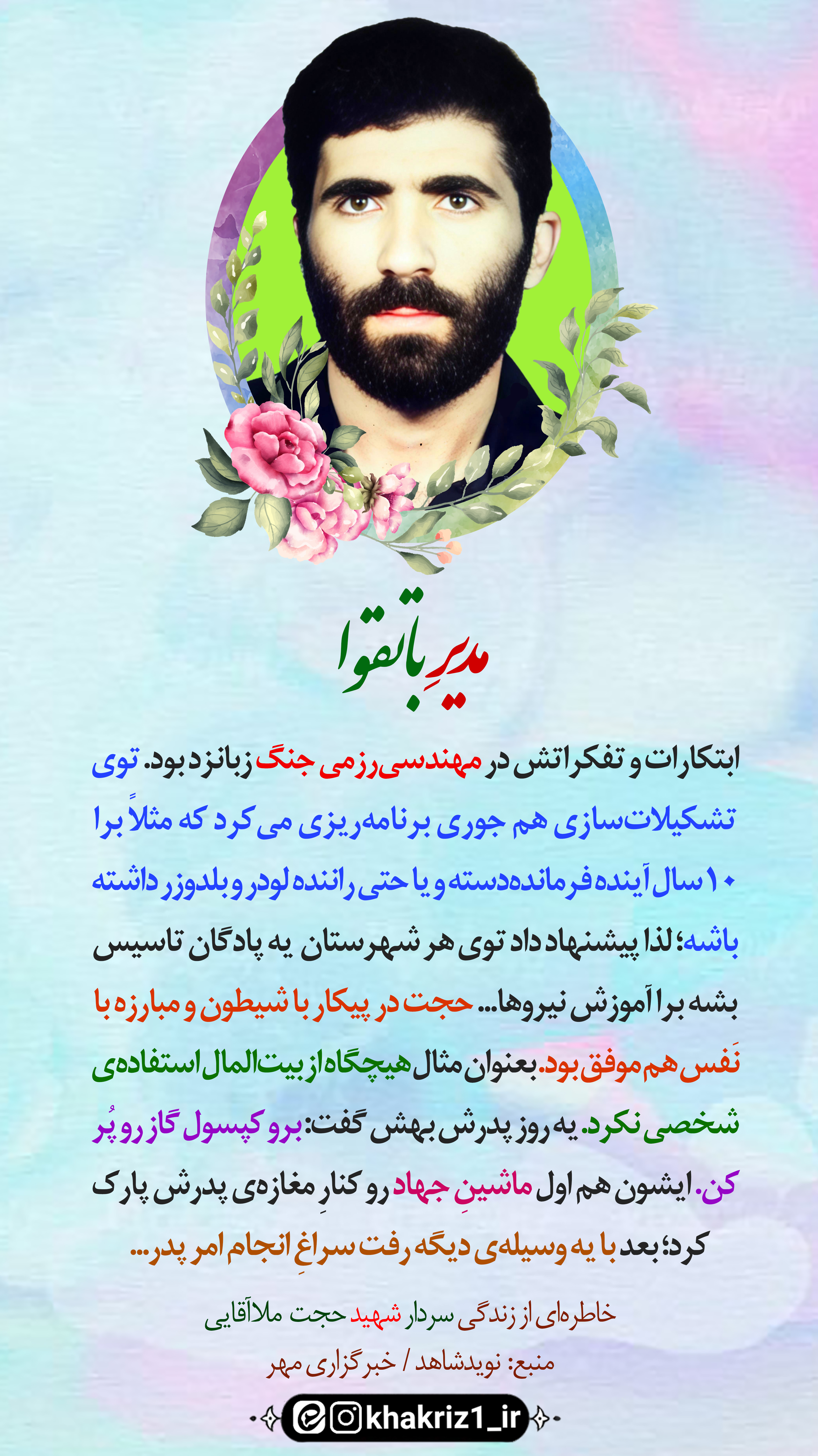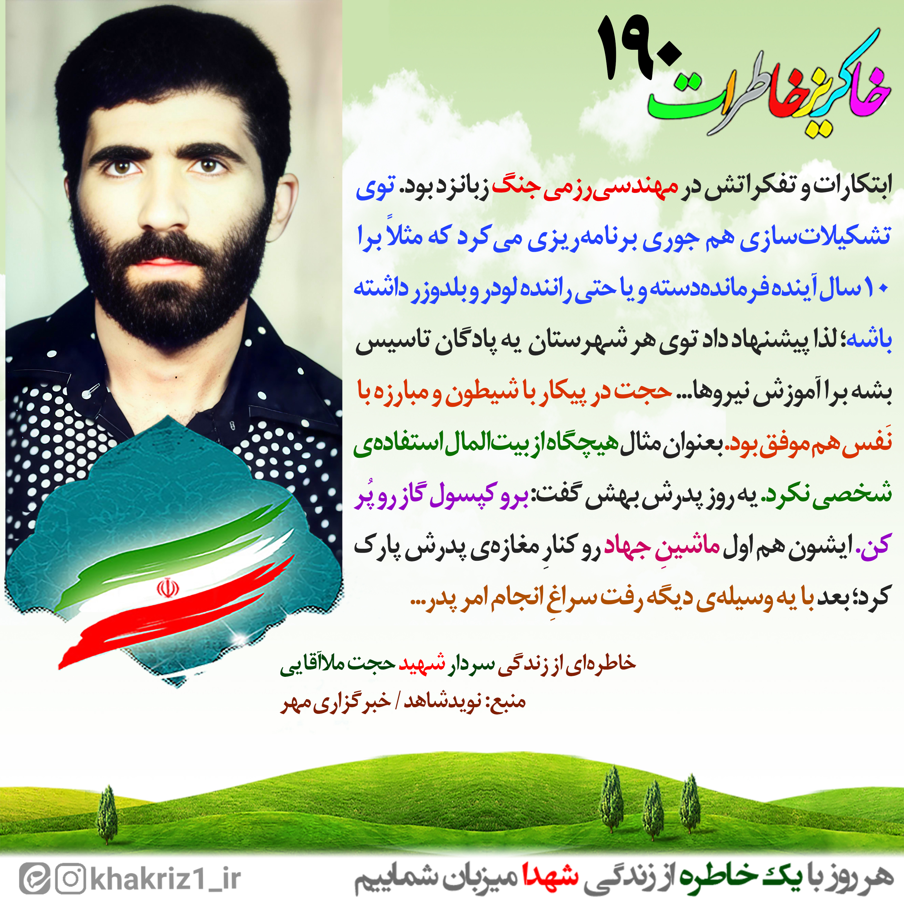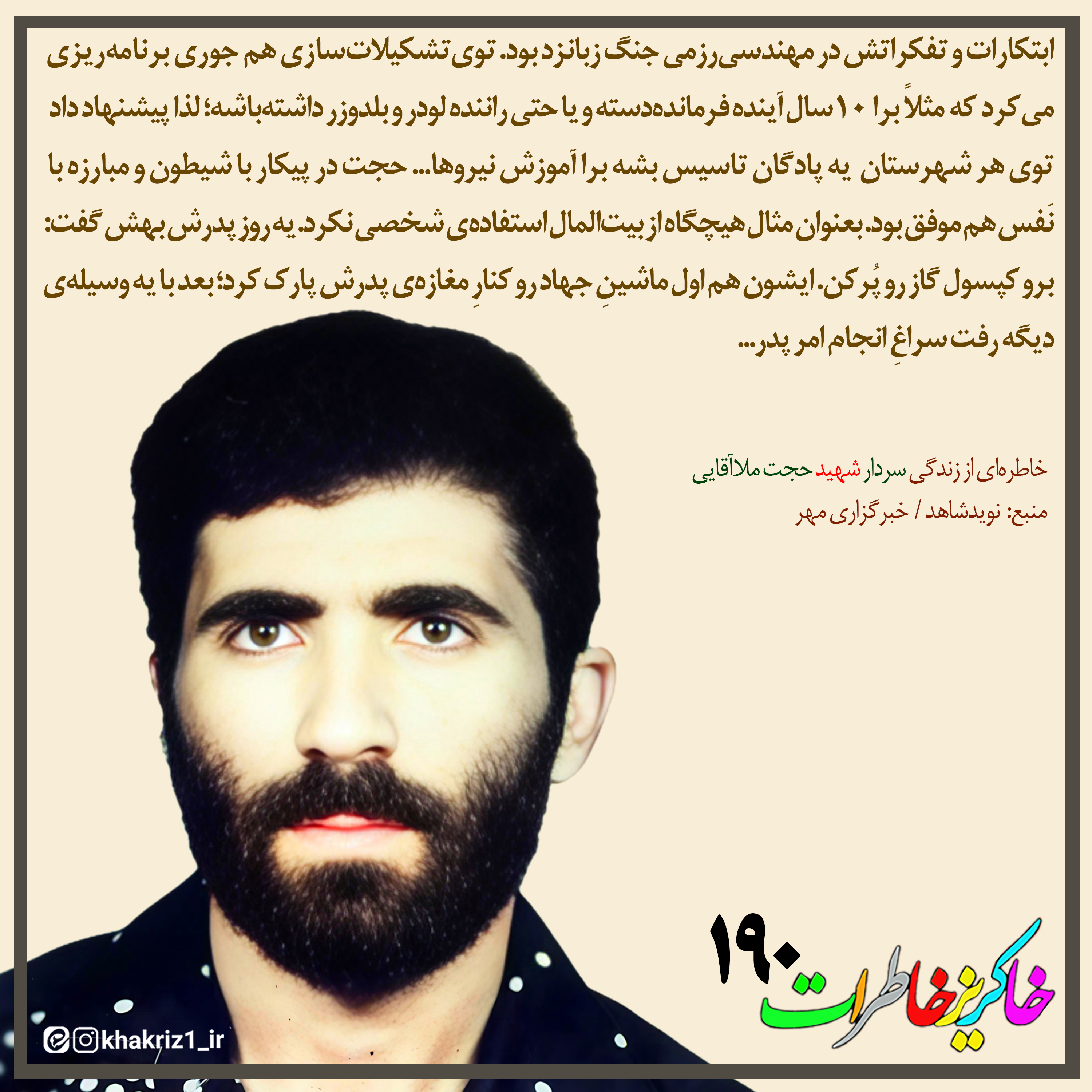 #متن_خاطره|ابتکارات و تفکراتش در مهندسی رزمی جنگ زبانزد بود. توی تشکیلاتسازی هم جوری برنامهریزی میکرد که مثلاً برا ۱۰سال آینده فرماندهدسته و یا حتی راننده لودر و بلدوزر داشته باشه؛ برا همین پیشنهاد داد توی هر شهرستان یه پادگان تاسیس بشه برا آموزش نیروها.... حجت توی پیکار با شیطون و مبارزه با نفس هم موفق بود. بعنوان مثال هیچگاه از ماشینِ بیتالمال استفادهی شخصی نکرد. یه روز پدرش بهش گفت: برو کپسول گاز رو پر کن... ایشون هم اول ماشینِ جهاد رو کنار مغازه باباش پار کرد؛ بعد با یه وسیلهی دیگه رفت سراغِ انجام امر پدر...