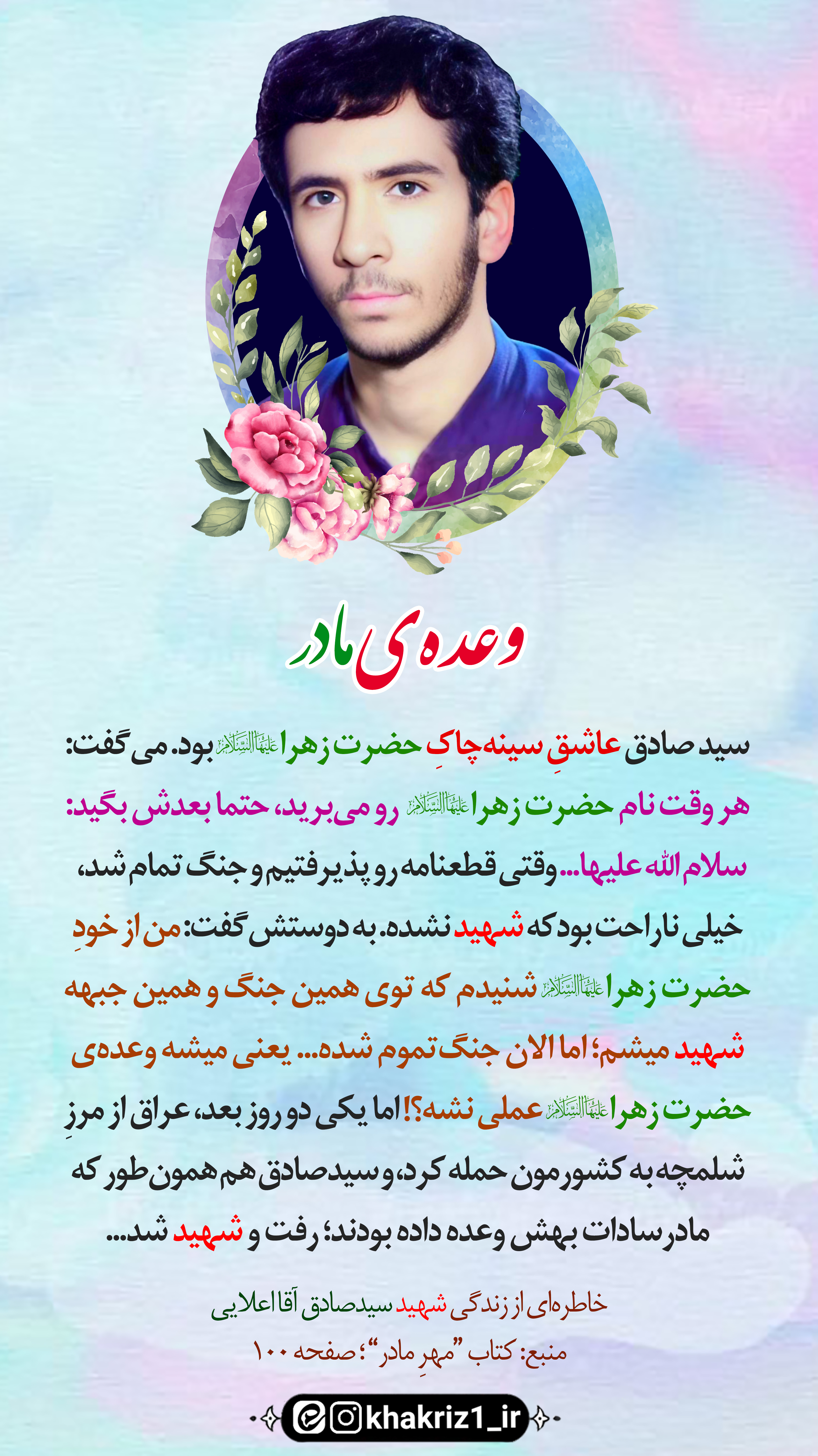 #متن_خاطره|سیدصادق عاشقِ سینهچاکِ حضرت زهرا(س) بود. میگفت: هر وقت نام حضرت زهرا(س) رو میبرید، حتما بعدش بگید: سلام الله علیها... وقتی قطعنامه رو پذیرفتیم و جنگ تمام شد، خیلی ناراحت بودکه شهید نشده. به دوستشگفت: من از خودِ حضرت زهرا(س) شنیدم که توی همین جنگ و همین جبهه شهید میشم؛ اما الان جنگ تموم شده... یعنی میشه وعدهی حضرت زهرا(س) عملی نشه؟! اما یکی دو روز بعد، عراق از مرزِ شلمچه به کشورمون حمله کرد، و سیدصادق هم همونطور که مادرسادات بهش وعده داده بودند؛ رفت و شهید شد...