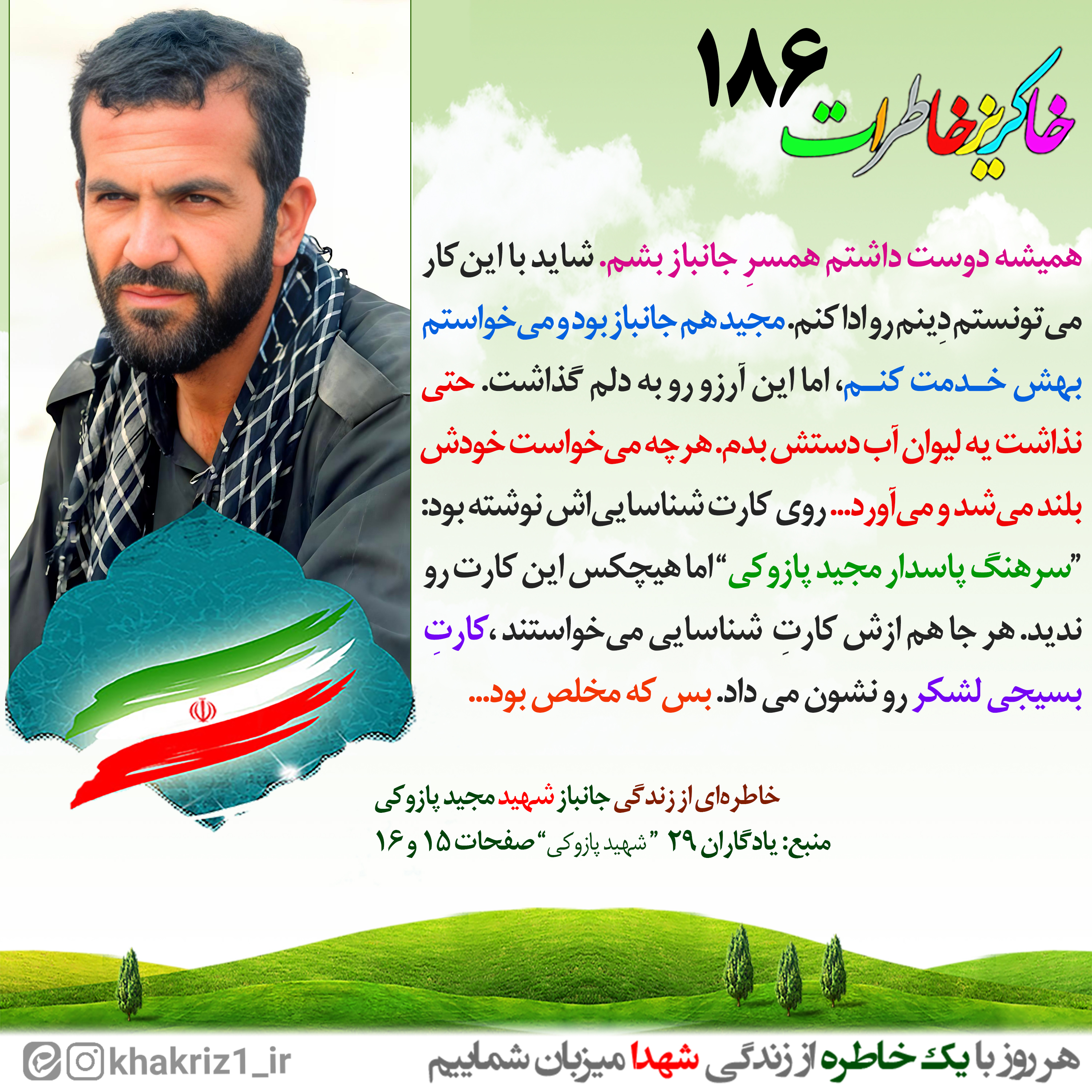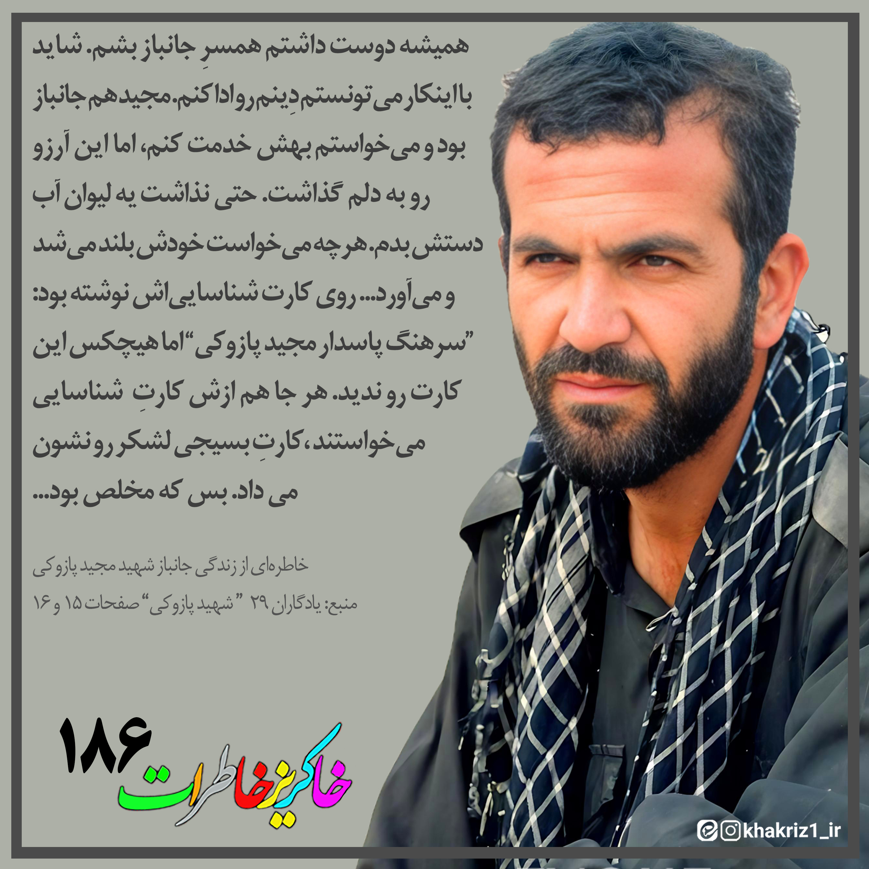 #متن_خاطره|همیشه دوست داشتم همسرِ جانباز بشم. شاید با اینکار میتونستم دِینم رو ادا کنم. مجید هم جانباز بود و میخواستم بهش خدمت کنم، اما این آرزو رو به دلم گذاشت. حتی نذاشت یه لیوان آب دستش بدم. هرچه میخواست خودش بلند میشد و میآورد... روی کارت شناساییاش نوشته بود: “سرهنگ پاسدار مجید پازوکی” اما هیچکس این کارت رو ندید. هر جا هم ازش کارتِ شناسایی میخواستند ،کارتِ بسیجی لشکر رو نشون میداد. بس که مُخلص بود...