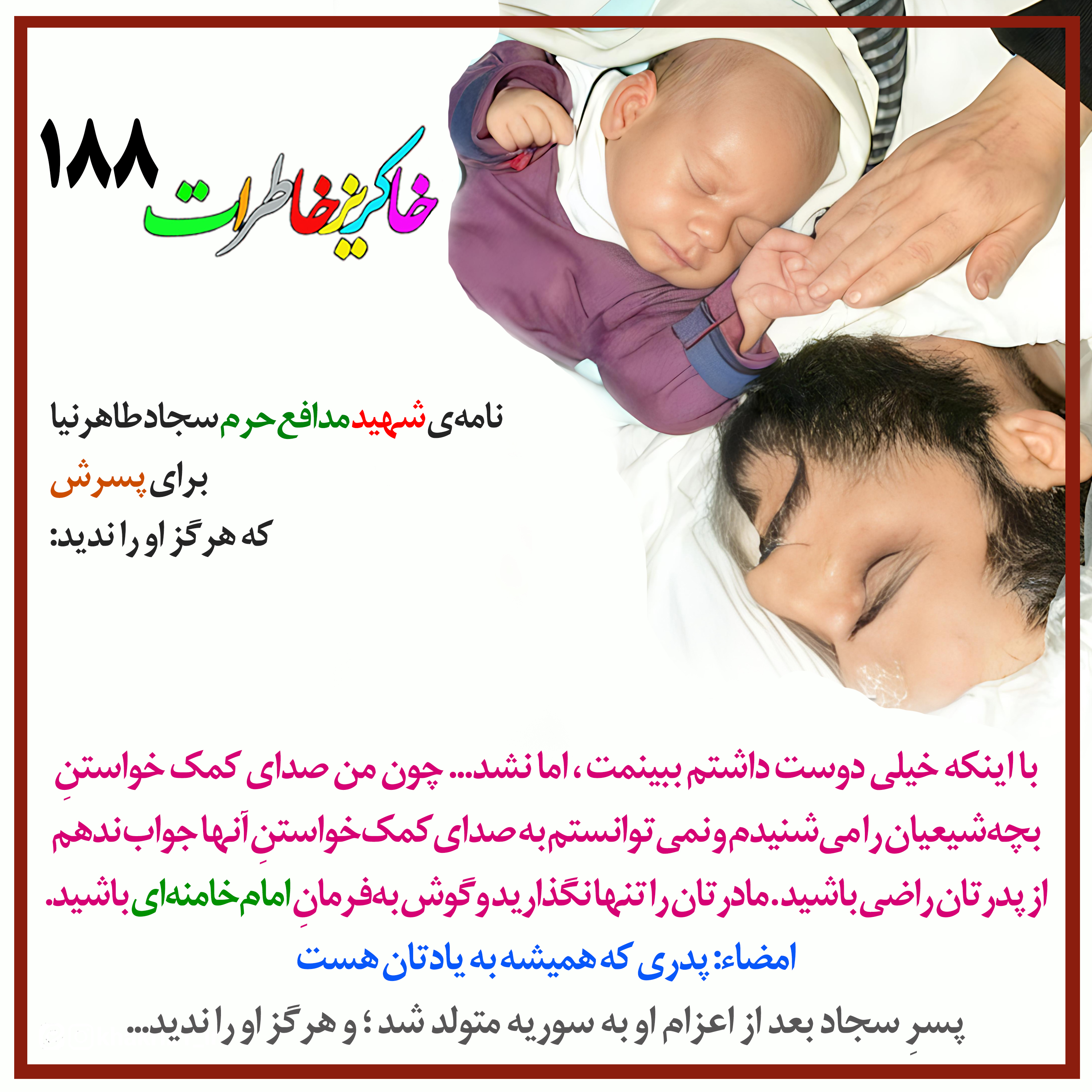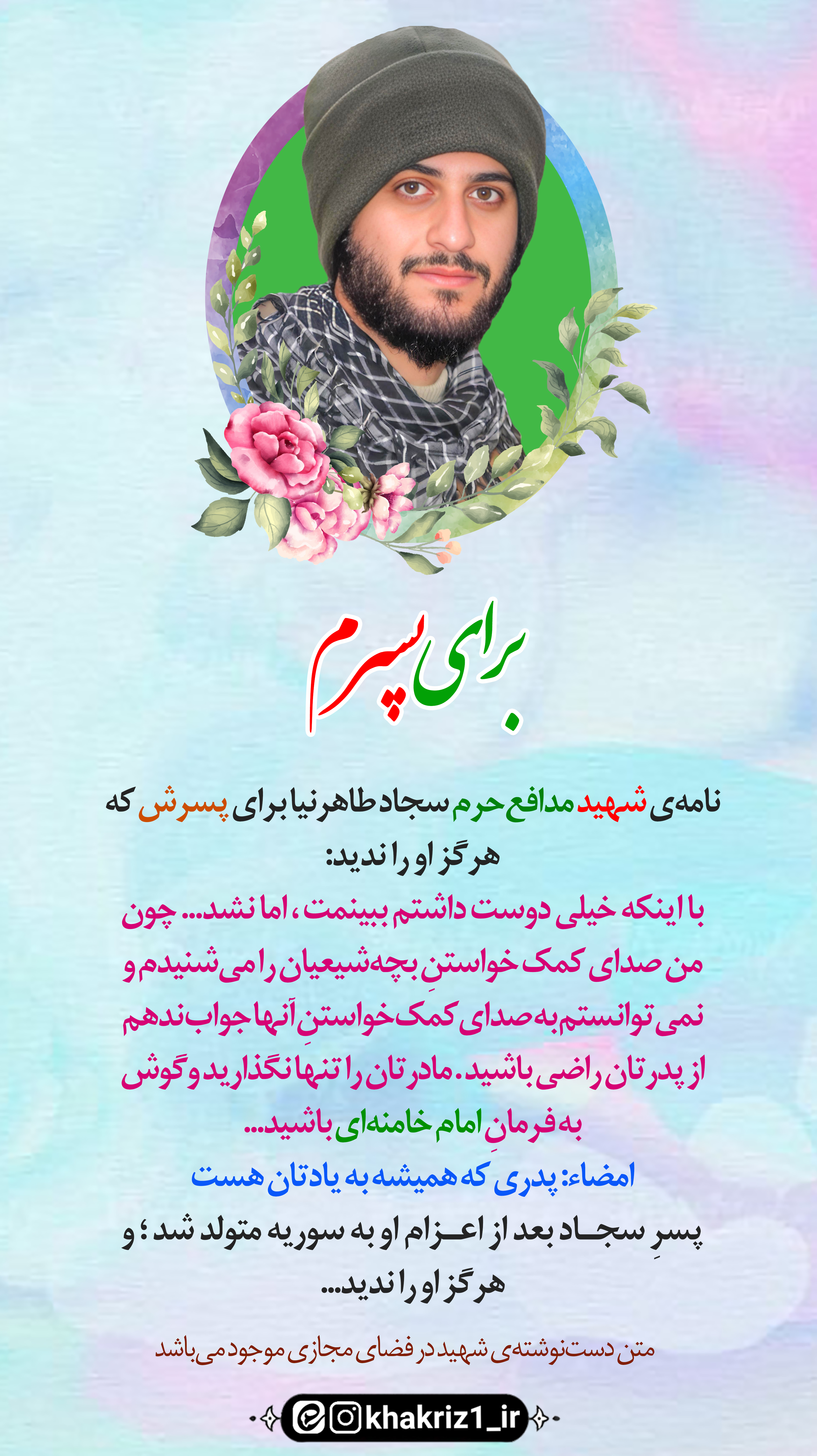 #متن_خاطره|نامهی شهید مدافعحرم سجاد طاهرنیا برای پسرش که هرگز او را ندید: "با اینکه خیلی دوست داشتم ببینمت، اما نشد... چون من صدای کمک خواستنِ بچه شیعیان را میشنیدم و نمیتوانستم به صدای کمک خواستنِ آنها جواب ندهم. از پدرتان راضی باشید. مادرتان را تنها نگذارید و گوش به فرمانِ امامخامنهای باشید...